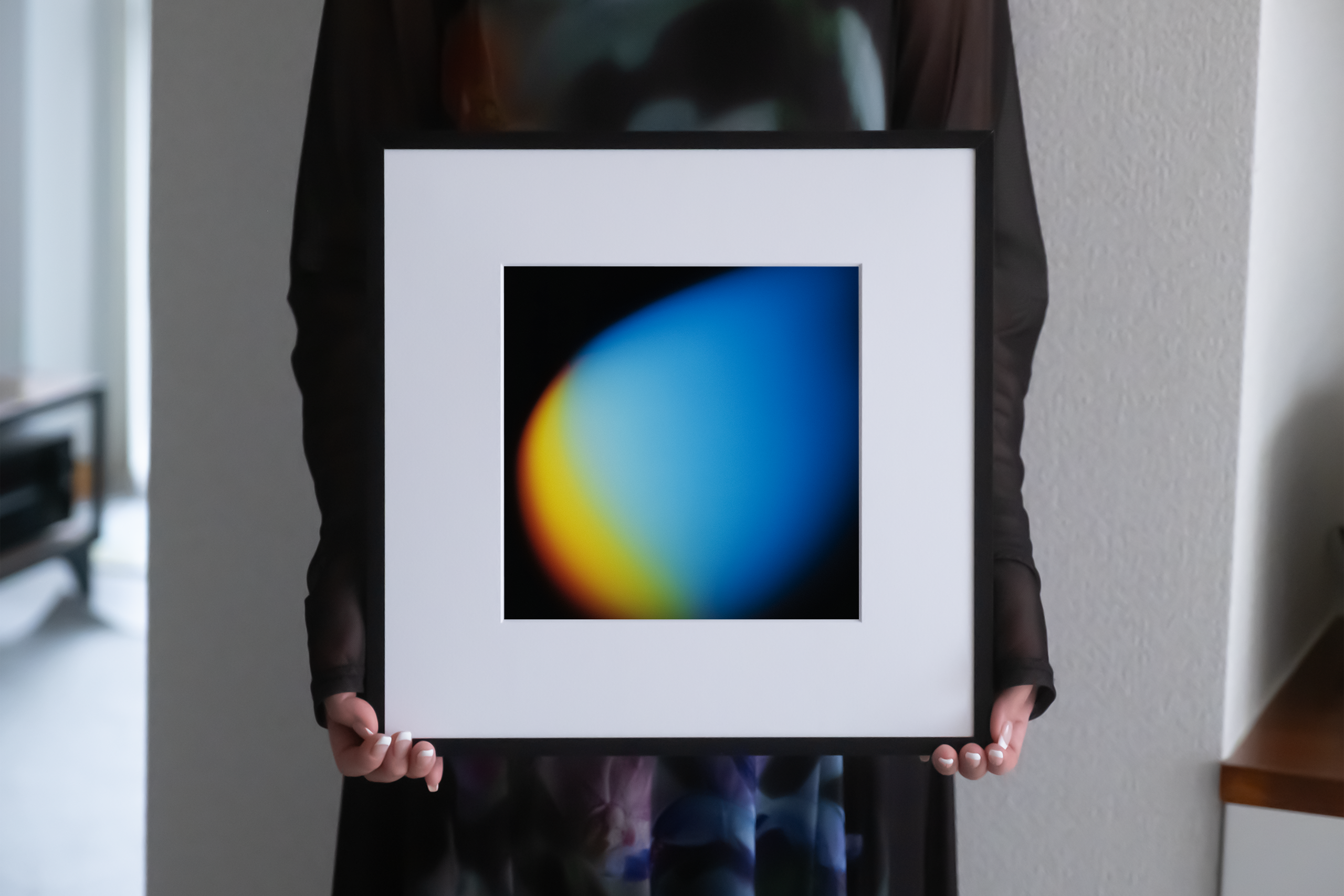 作品は額装し、専用のパッケージに丁寧に包んだ上で、さらに外箱に梱包してお送りします。パッケージには作者のサイン入りで日付の証明書を同梱し、薄葉紙で優しく包んでいます。